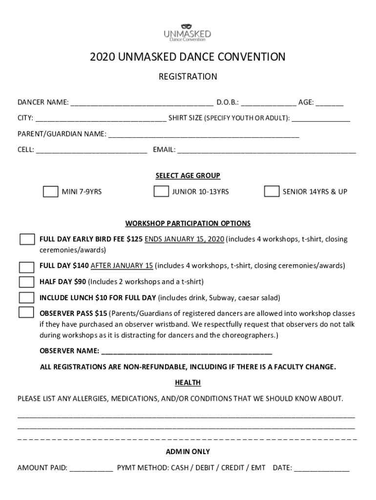 2020 UNMASKED DANCE CONVENTION REGISTRATION DANCER NAME: D.O.B.: AGE: CITY: SHIRT SIZE (SPECIFY YOUTH OR ADULT): PARENT/GUARDIAN NAME: CELL: EMAIL: SELECT AGE GROUP MINI 79YRSJUNIOR 1013YRSSENIOR