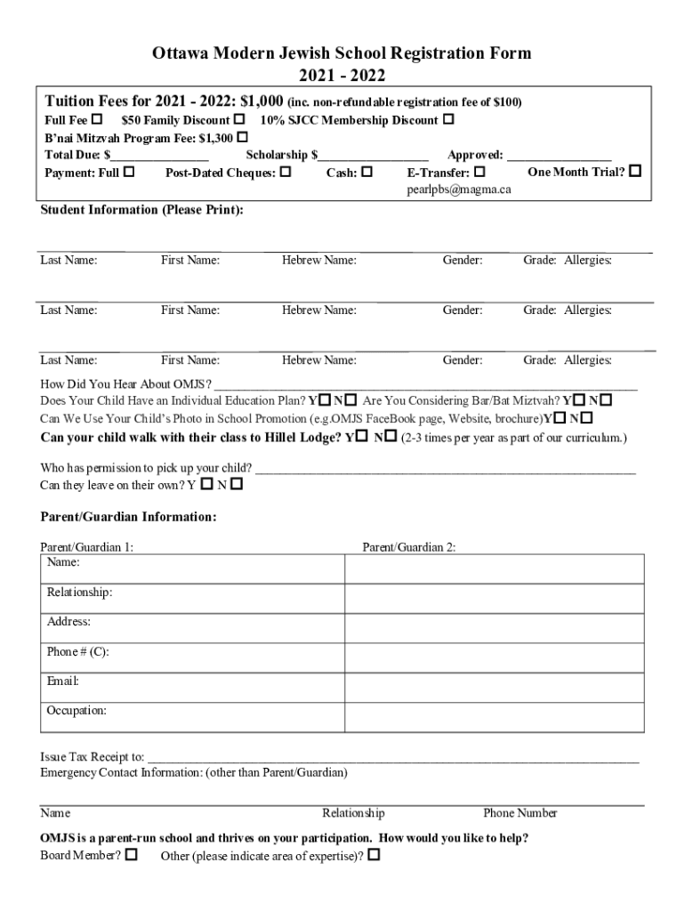 Ottawa Modern Jewish School Registration Form 2021 2022 Tuition Fees for 2021 2022: $1,000 (inc. nonrefundable registration fee of $100) Full Fee $50 Family Discount 10% SCC Membership Discount Bani