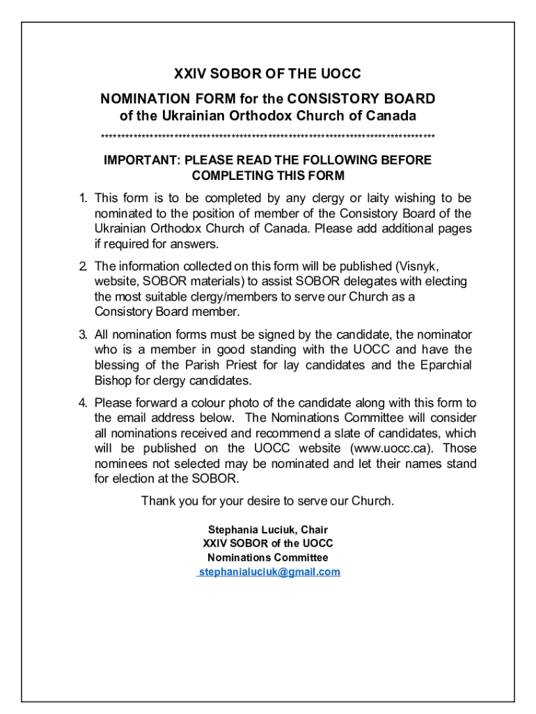 XXIV SOBER OF THE OCC NOMINATION FORM for the CONSISTORY BOARD of the Ukrainian Orthodox Church of Canada **********************************************************************************IMPORTANT: