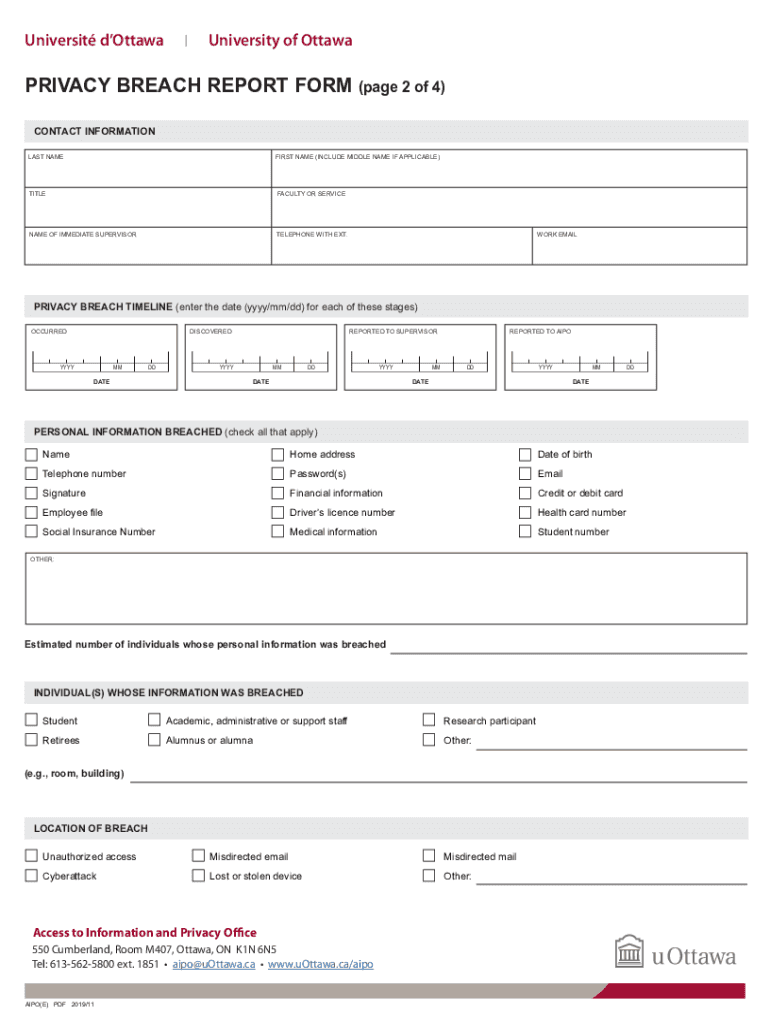 University Ottawa|University of OttawaPRIVACY BREACH REPORT FORM (page 1 of 4) A privacy breach refers to the loss of, unauthorized access to, or disclosure of, personal information under the Universities