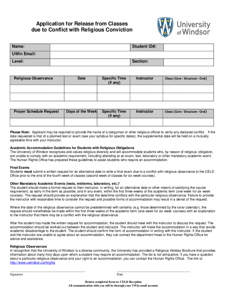 Application for Release from Classes due to Conflict with Religious Conviction Name:Student ID#:Win Email: Level:Religious ObservancePrayer Schedule RequestSection:Interspecific Time (if any)InstructorClass