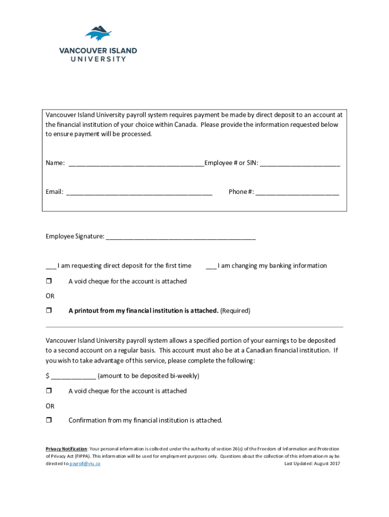 Vancouver Island University payroll system requires payment be made by direct deposit to an account at the financial institution of your choice within Canada. Please provide the information requested
