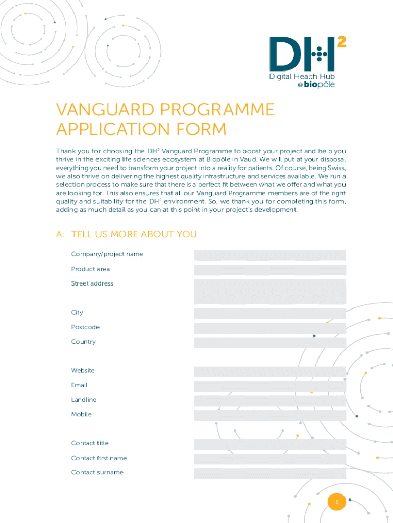 VANGUARD Program APPLICATION FORM Thank you for choosing the DH2 Vanguard Program to boost your project and help you thrive in the exciting life sciences ecosystem at People in Maud. We will put at