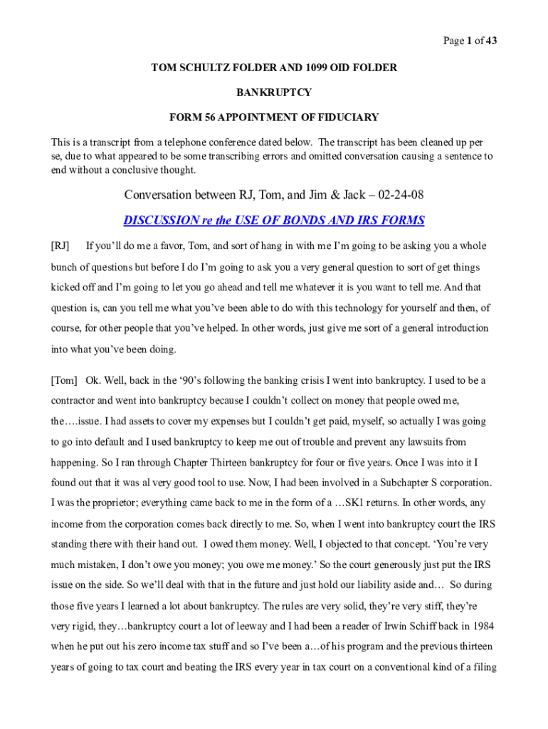 Page !1 of !43 TOM SCHULTZ Folders AND 1099 DID FOLDER BANKRUPTCY FORM 56 APPOINTMENT OF FIDUCIARY This is a transcript from a telephone conference dated below. The transcript has been cleaned up