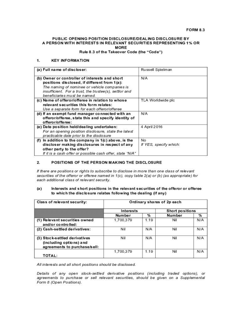 FORM 8.3 PUBLIC OPENING POSITION DISCLOSURE/DEALING DISCLOSURE BY A PERSON WITH INTERESTS IN RELEVANT SECURITIES REPRESENTING 1% OR MORE Rule 8.3 of the Takeover Code (the Code) 1. KEY INFORMATION