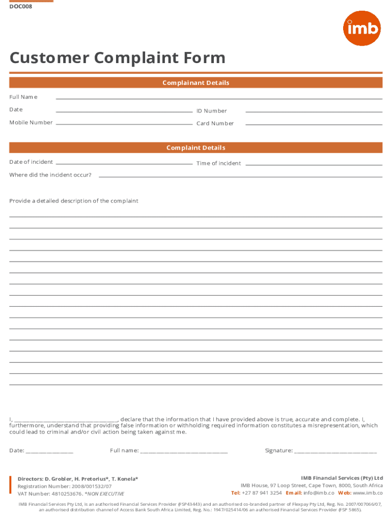 DOC008Customer Complaint Form Complainant Details Full Name Dated Number Mobile Lumberyard NumberComplaint Details Date of incidentTime of incidentWhere did the incident occur? Provide a detailed