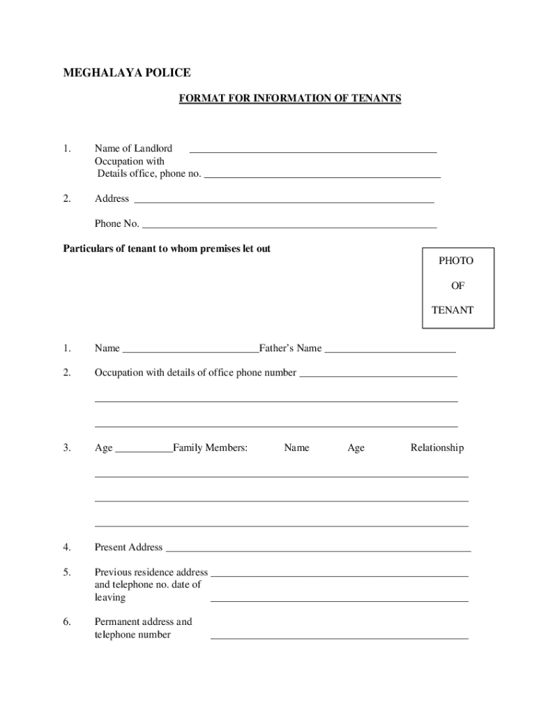 MEGHALAYA POLICE FORMAT FOR INFORMATION OF TENANTS1. Name of Landlord Occupation with Details office, phone no. 2. Address Phone No. Particulars of tenant to whom premises let out PHOTO TENANT1. Name