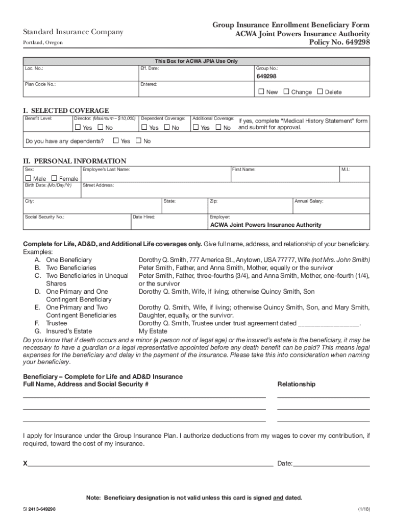 Reset Group Insurance Enrollment Beneficiary Form CWA Joint Powers Insurance Authority Policy No. 649298Standard Insurance Company Portland, Oregonians Box for CWA APIA Use Only LOC. No.:Eff. Date:Plan