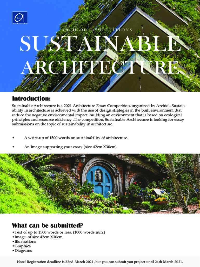 ARCHIVE COMPETITIONSSUSTAINABLE ARCHITECTURE Introduction: Sustainable Architecture is a 2021 Architecture Essay Competition, organized by Archive. Sustainability in architecture is achieved with