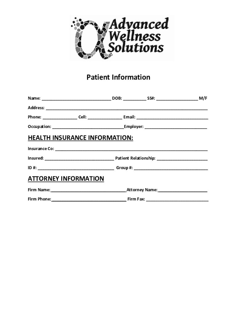 Patient Information Name: DOB: SS#: M/F Address: Phone: Cell: Email: Occupation: Employer: HEALTH INSURANCE INFORMATION: Insurance Co: Insured: Patient Relationship: ID #: Group #: ATTORNEY INFORMATION