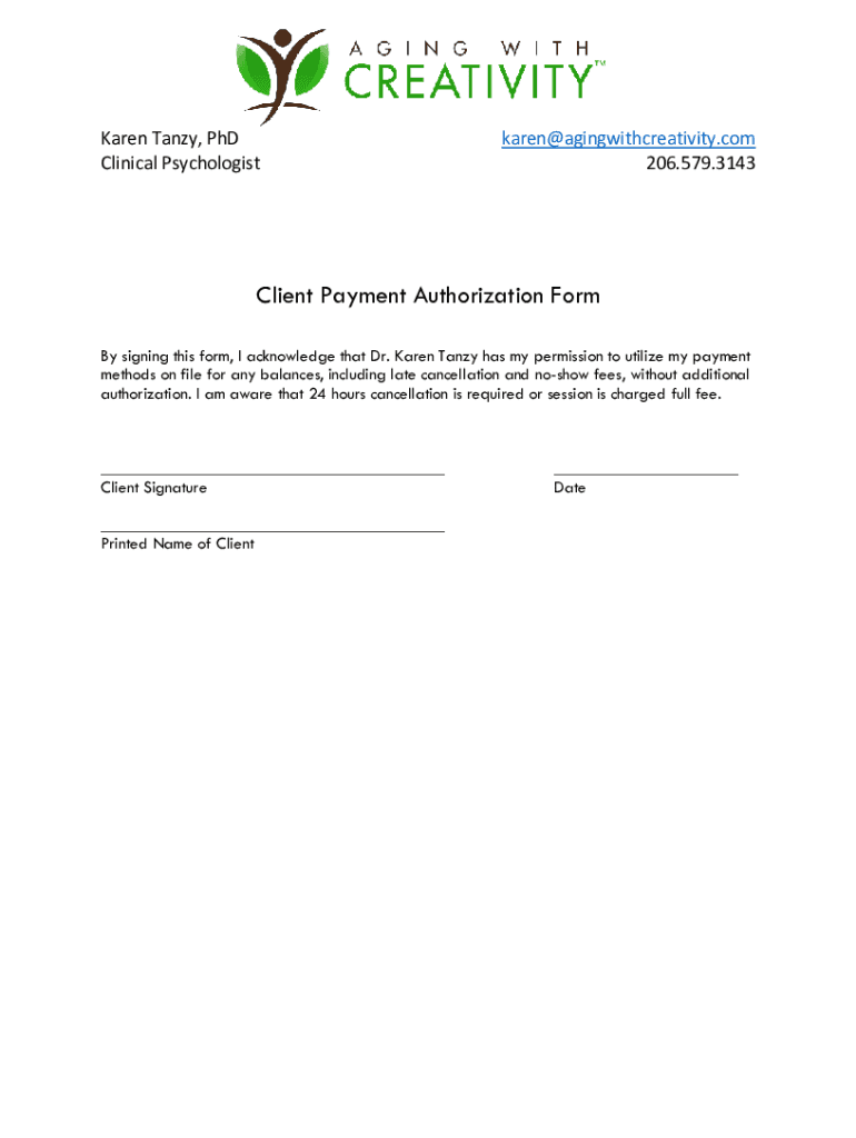 Karen Taney, PhD Clinical Psychologistkaren agingwithcreativity.com 206.579.3143Client Payment Authorization Form By signing this form, I acknowledge that Dr. Karen Taney has my permission to utilize