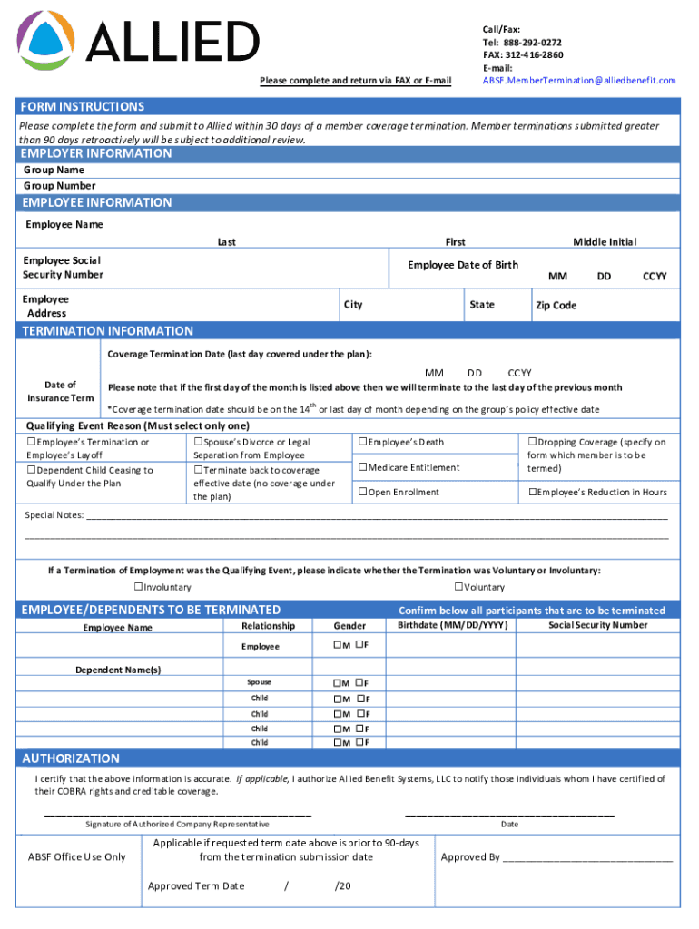 Call/Fax: Tel:8882920272 FAX:3124162860 Email: ABSF.MemberTermination@alliedbenefit.comPleasecompleteandreturnviaFAXorEmailFORMINSTRUCTIONS PleasecompletetheformandsubmittoAlliedwithin30daysofamembercoveragetermination.