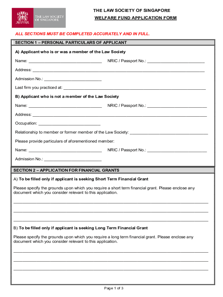 THE LAW SOCIETY OF SINGAPORE WELFARE FUND APPLICATION FORMAL SECTIONS MUST BE COMPLETED ACCURATELY AND IN FULL. SECTION 1 PERSONAL PARTICULARS OF APPLICANT A) Applicant who is or was a member of the