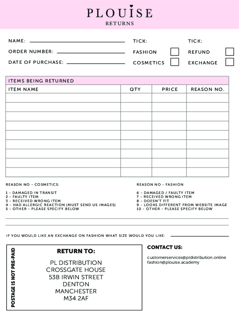 NAM E :TICK:TICK:OR D E R NU M B ER:FASHION ARE FUND DATE OF PU R C HAS E:CO SME TICS OCHA N G EIT E MS BEI NG R E T U RED IT E M NA M EAT PRICER SON N O.REA SON N O CO SM E TI C S’RE A S ON N O