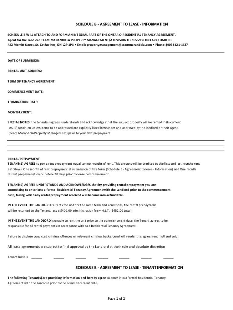 SCHEDULE B AGREEMENT TO LEASE INFORMATION SCHEDULE B WILL ATTACH TO AND FORM AN INTEGRAL PART OF THE ONTARIO RESIDENTIAL TENANCY AGREEMENT. Agent for the Landlord TEAM MARADONA PROPERTY MANAGEMENT/A