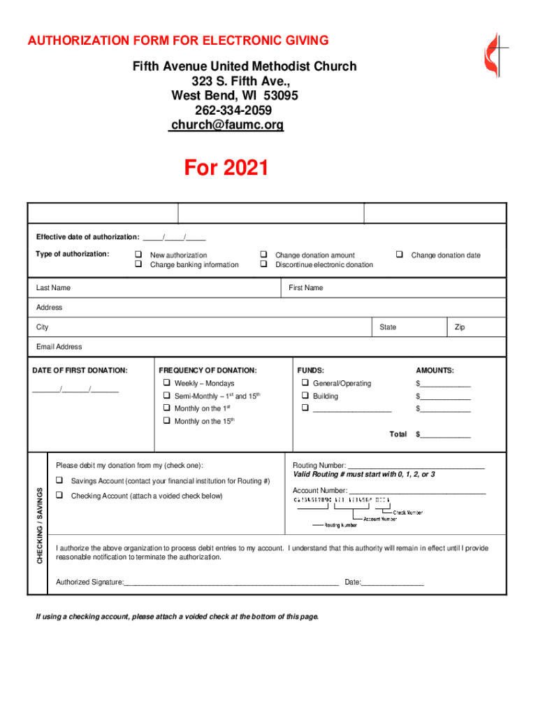 AUTHORIZATION FORM FOR ELECTRONIC GIVING Fifth Avenue United Methodist Church 323 S. Fifth Ave., West Bend, WI 53095 2623342059 church farm. Orator 2021Effective date of authorization: / / Type of