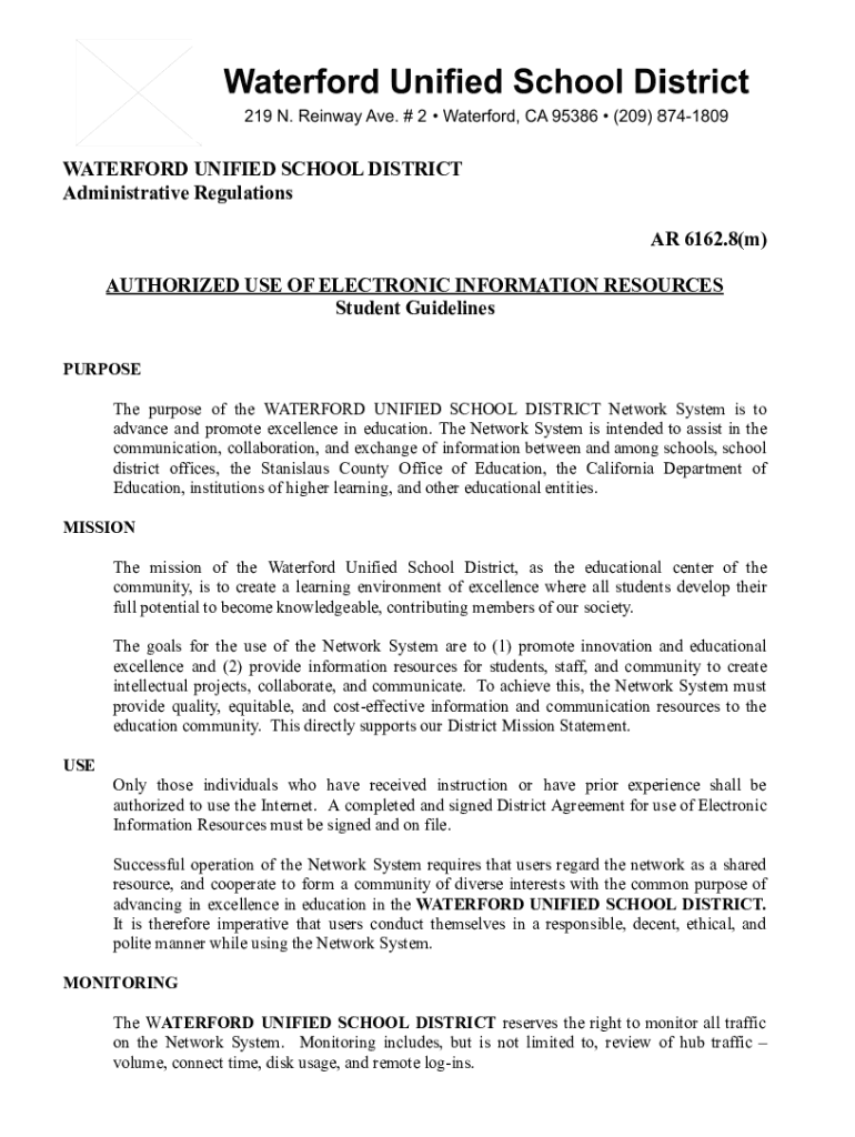 WATERFORD UNIFIED SCHOOL DISTRICT Administrative Regulations AR 6162.8(m) AUTHORIZED USE OF ELECTRONIC INFORMATION RESOURCES Student Guidelines PURPOSE The purpose of the WATERFORD UNIFIED SCHOOL