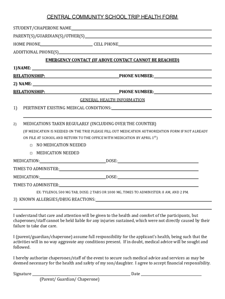 CENTRAL COMMUNITY SCHOOL TRIP HEALTH FORM STUDENT/CHAPERONE NAME PARENT(S)/GUARDIAN(S)/OTHER(S) HOME PHOTOCELL PHONEADDITIONAL PHONE(S) EMERGENCY CONTACT (IF ABOVE CONTACT CANNOT BE REACHED) 1)NAME:
