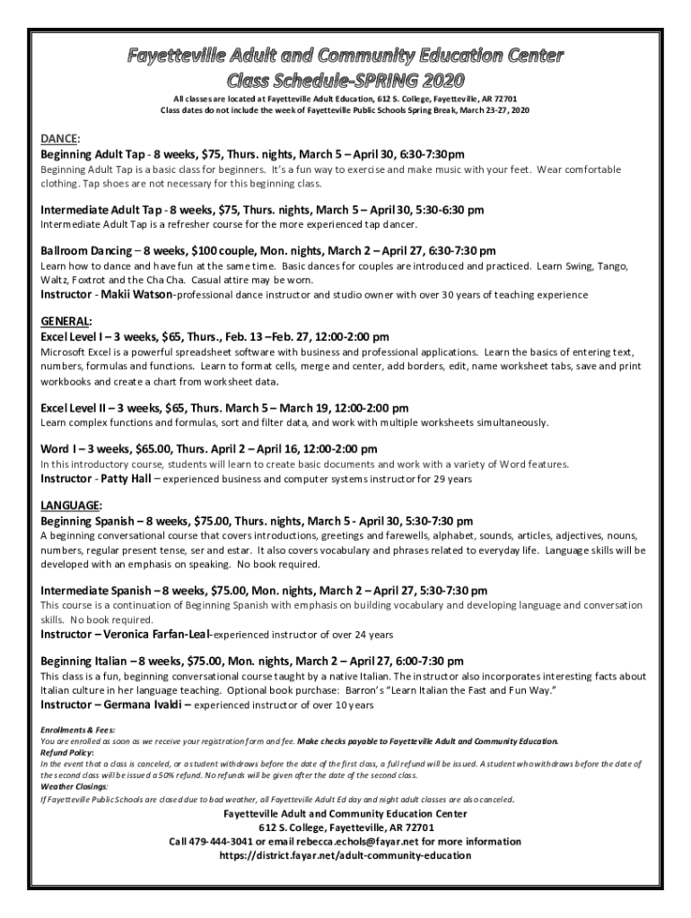 All classes are located at Fayetteville Adult Education, 612 S. College, Fayetteville, AR 72701 Class dates do not include the week of Fayetteville Public Schools Spring Break, March 2327, 2020DANCE: