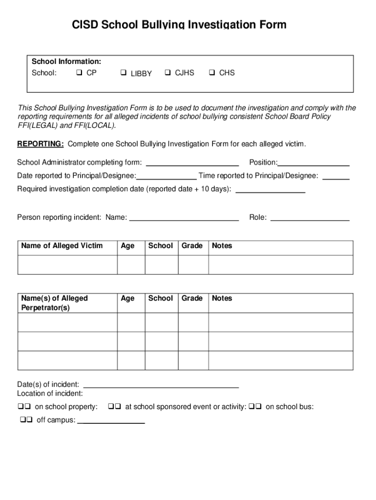 To fill out the bullying investigation form updated, individuals should provide detailed information about the incident, including date, time, location, witnesses, and a description of the behavior.