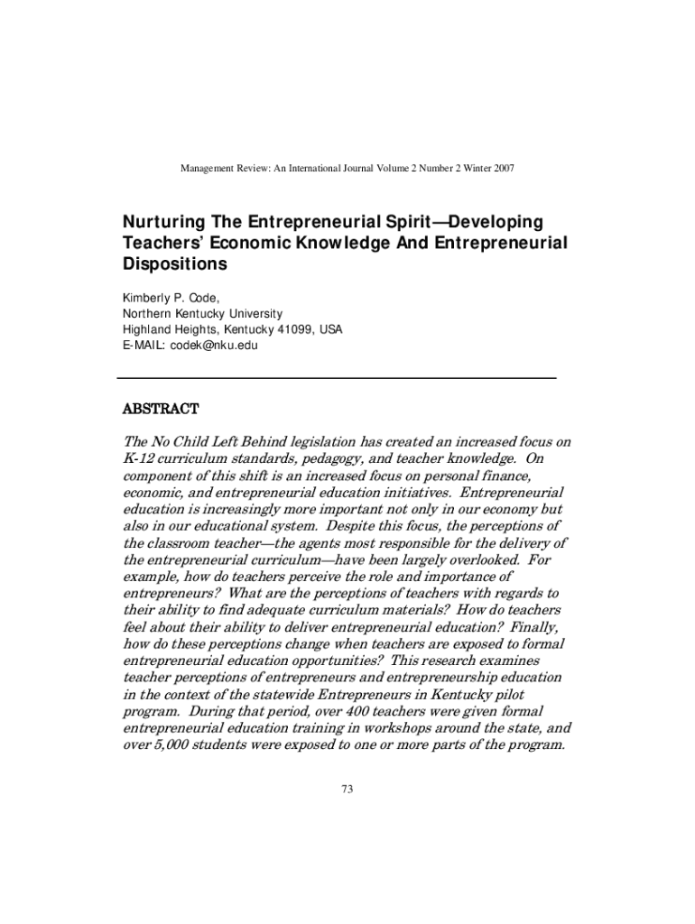 Management Review: An International Journal Volume 2 Number 2 Winter 2007Nurturing The Entrepreneurial SpiritDeveloping Teachers Economic Knowledge And Entrepreneurial Dispositions Kimberly P. Code,