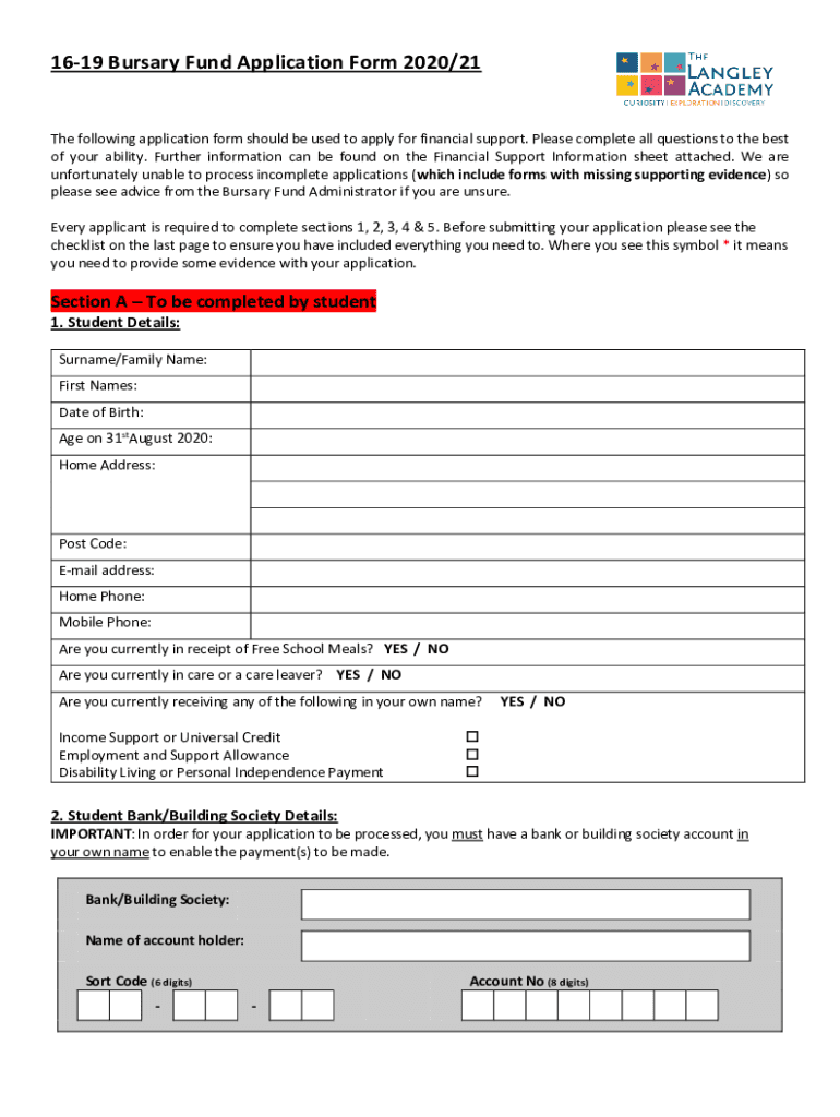 1619 Bursary Fund Application Form 2020/21The following application form should be used to apply for financial support. Please complete all questions to the best of your ability. Further information