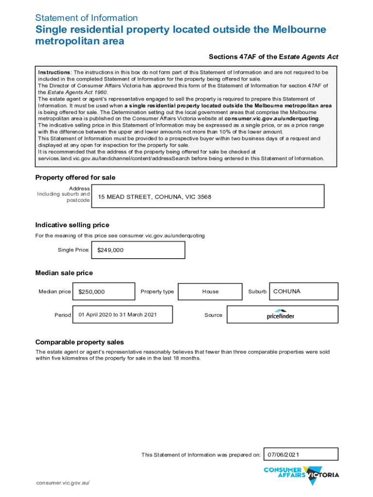 Statement of InformationSingle residential property located outside the Melbourne metropolitan area Sections 47AF of the Estate Agents Act Instructions: The instructions in this box do not form part
