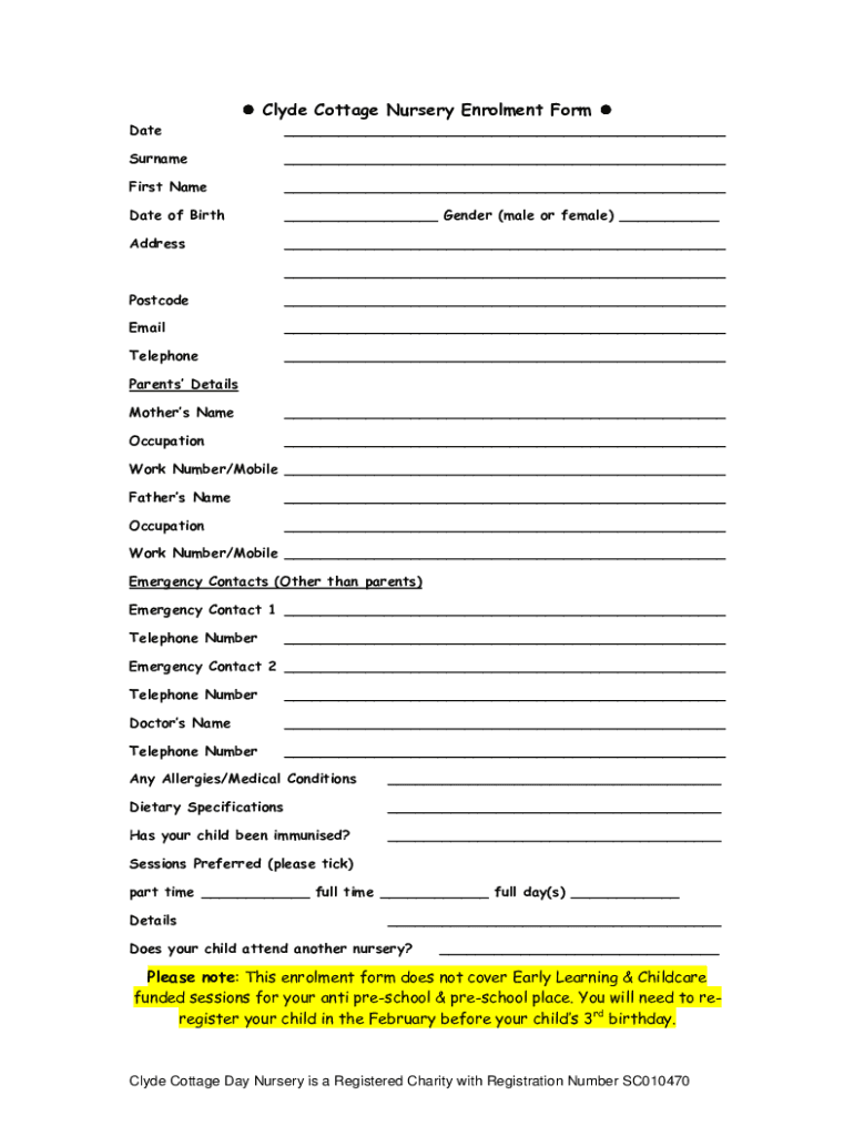 Get the free Clyde Cottage Nursery Enrolment Form amended 27.02.14