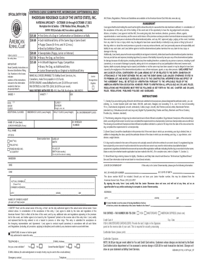 Get the free OFFICIAL ENTRY FORM RHODESIAN RIDGEBACK CLUB OF THE UNITED ...