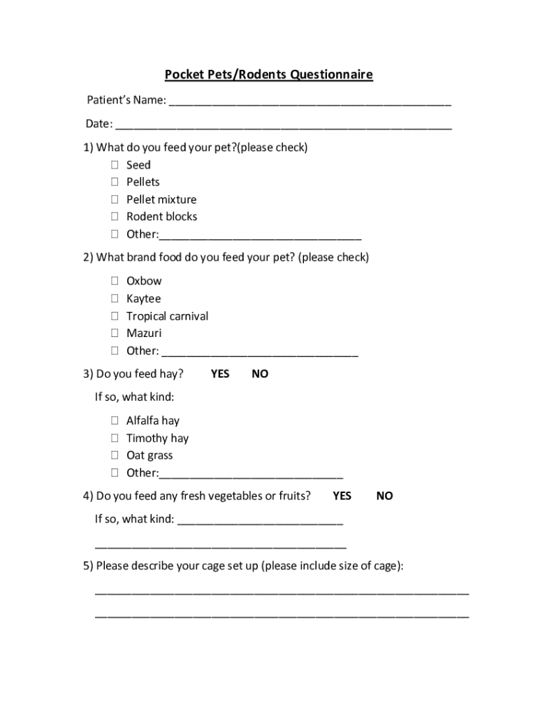 Pocket Pets/Rodents Questionnaire Patients Name: Date: 1) What do you feed your pet?(please check) Seed Pellets Pellet mixture Rodent blocks Other: 2) What brand food do you feed your pet? (please