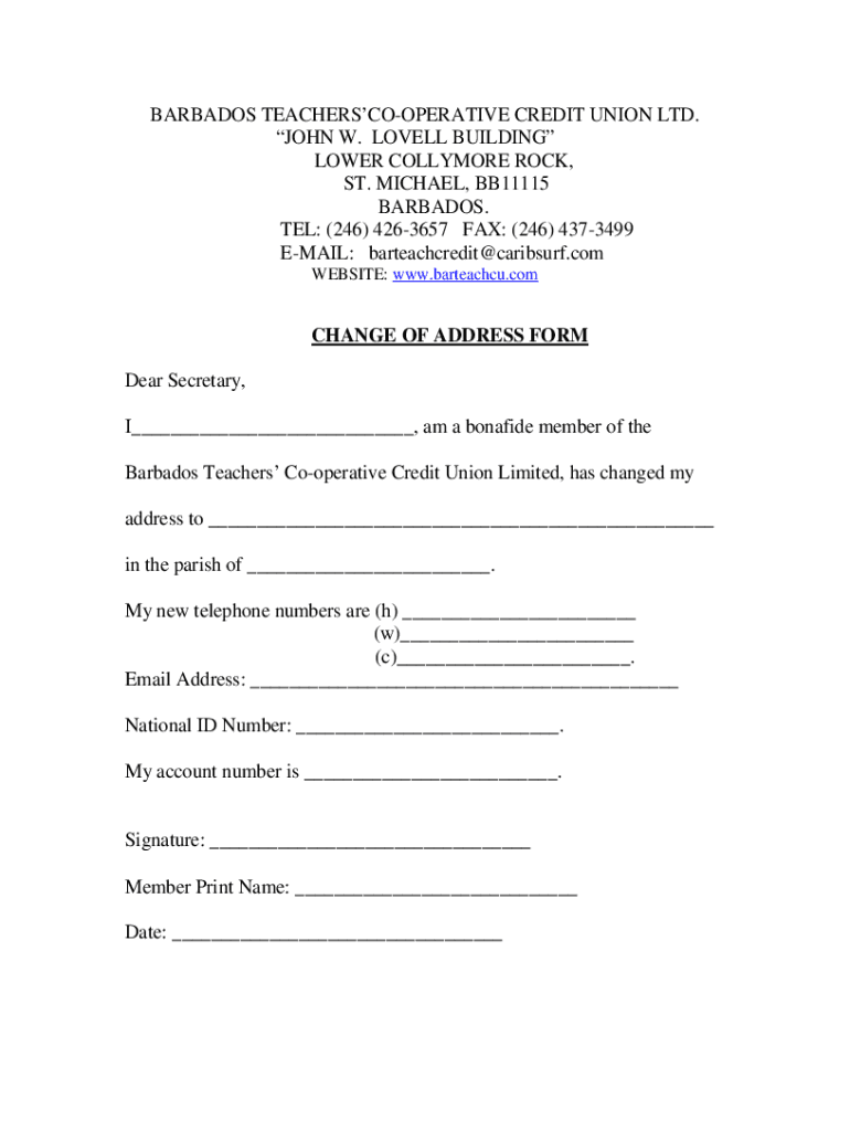 BARBADOS TEACHERSCOOPERATIVE CREDIT UNION LTD. JOHN W. LOVELL BUILDING LOWER CLAYMORE ROCK, ST. MICHAEL, BB11115 BARBADOS. TEL: (246) 4263657 FAX: (246) 4373499 EMAIL: barteachcredit caribsurf.com