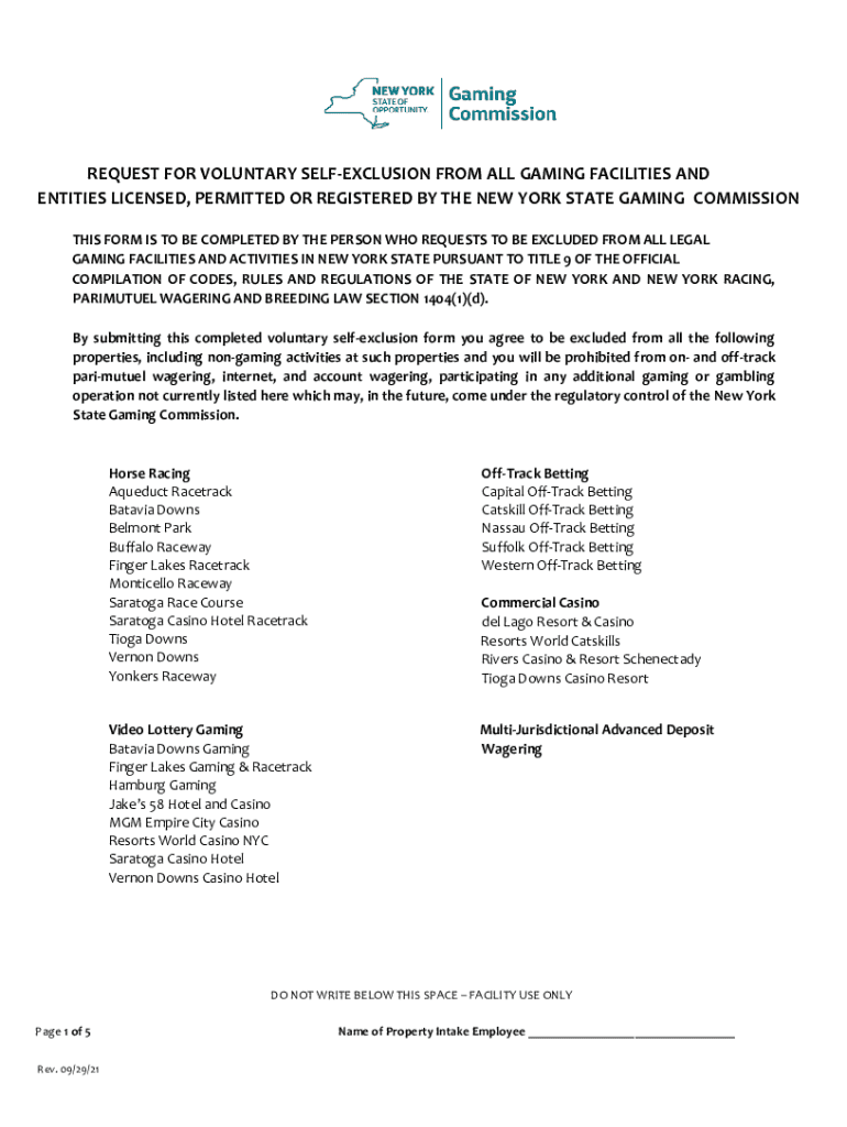 REQUEST FOR VOLUNTARY SELFEXCLUSION FROM ALL GAMING FACILITIES AND ENTITIES LICENSED, PERMITTED OR REGISTERED BY THE NEW YORK STATE GAMING COMMISSION THIS FORM IS TO BE COMPLETED BY THE PERSON WHO