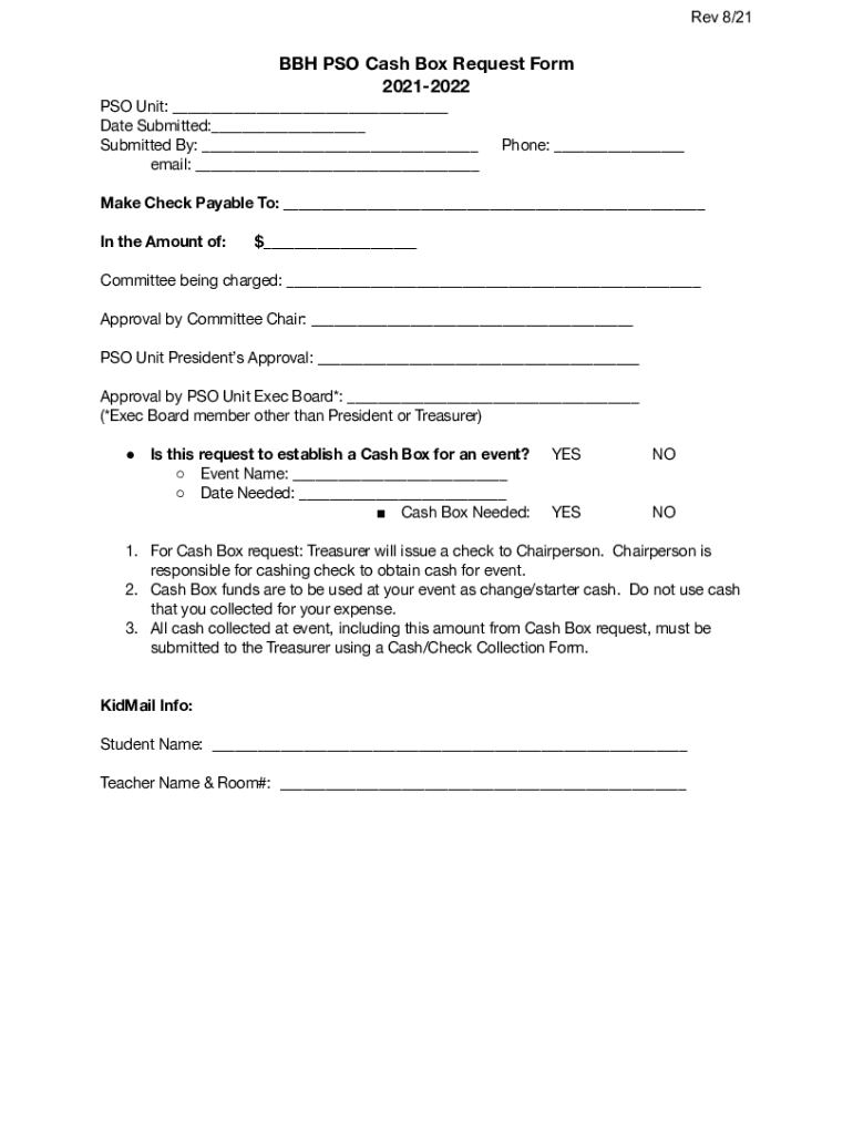 Rev 8/21BBH PSO Cash Box Request Form 20212022PSO Unit: Date Submitted: Submitted By: email: Phone: Make Check Payable To: In the Amount of:$ Committee being charged: Approval by Committee Chair: