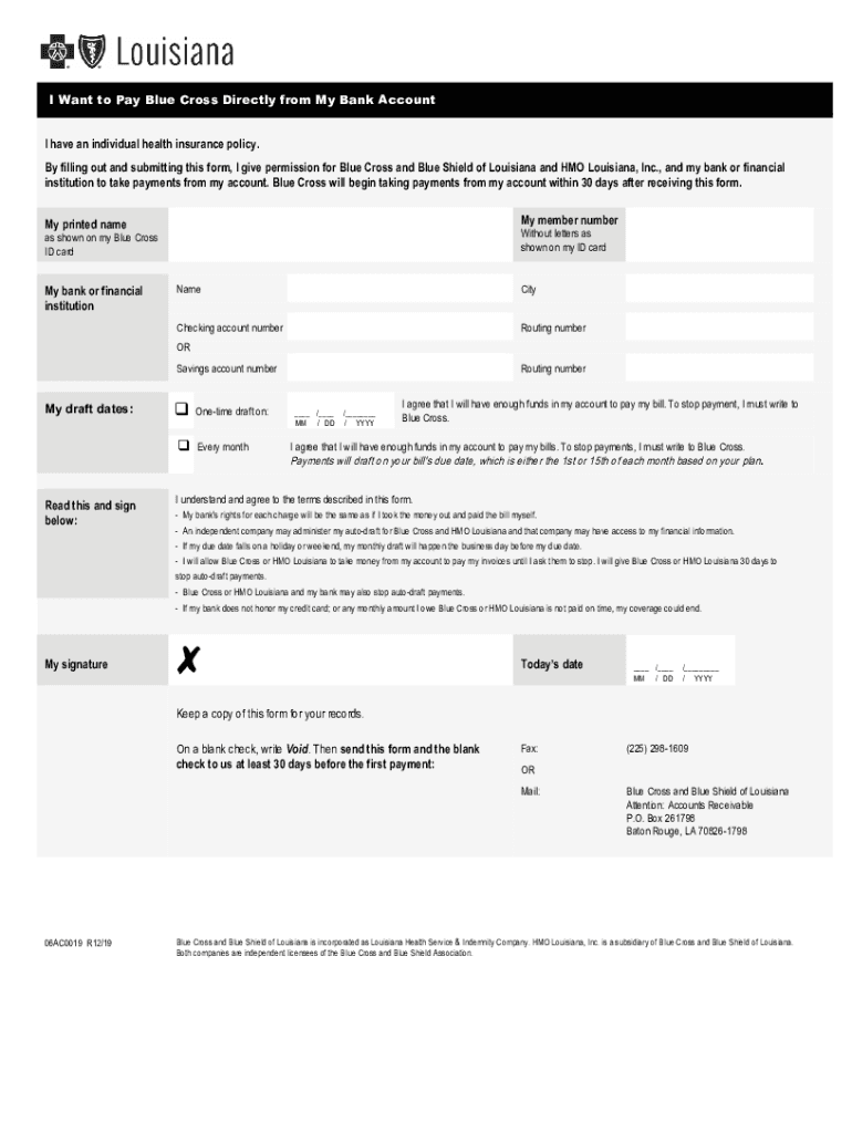 I Want to Pay Blue Cross Directly from My Bank Account I have an individual health insurance policy. By filling out and submitting this form, I give permission for Blue Cross and Blue Shield of Louisiana