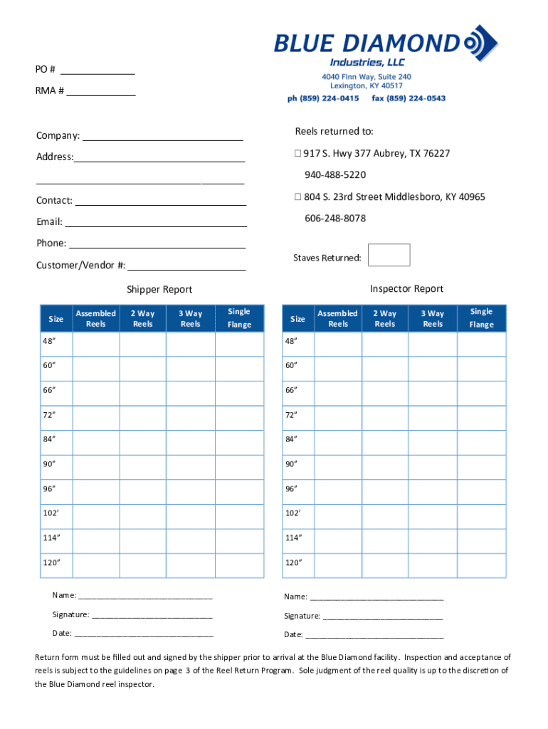 PO # RMA # Company: Reels returned to:Address: 917 S. Hwy 377 Aubrey, TX 76227 9404885220 Contact: 804 S. 23rd Street Middlebrow, KY 40965 6062488078Email: Phone: Customer/Vendor #: Staves Returned:Inspector