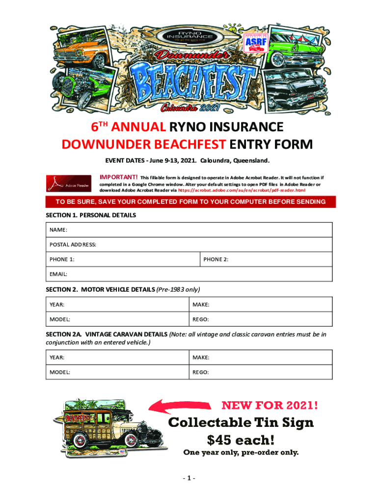 6TH ANNUAL RENO INSURANCE FOUNDER BEACHES ENTRY FORM EVENT DATES June 913, 2021. Alondra, Queensland. IMPORTANT! This fillable form is designed to operate in Adobe Acrobat Reader. It will not function