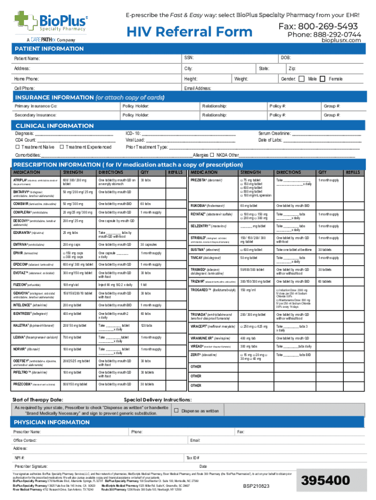 Prescribe the Fast & Easy way: select Bolus Specialty Pharmacy from your EHR! Fax: 8002695493HIV Referral Hormone: 8882920744 bioplusrx. Compartment INFORMATION Patient Name:SSN:DOB:Address:City:Home