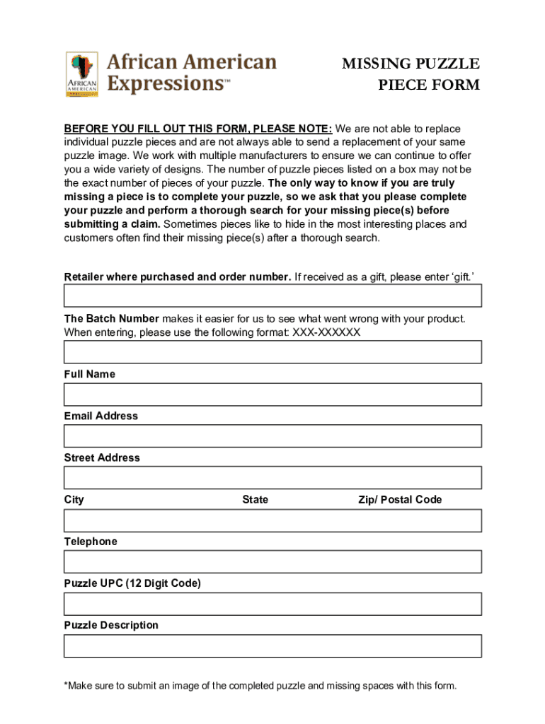 MISSING PUZZLE PIECE FORM BEFORE YOU FILL OUT THIS FORM, PLEASE NOTE: We are not able to replace individual puzzle pieces and are not always able to send a replacement of your same puzzle image. We