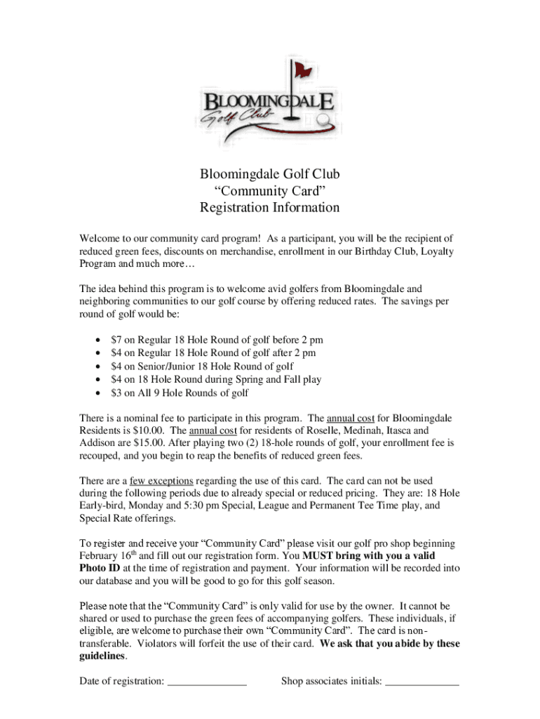 Bloomingdale Golf Club Community Card Registration Information Welcome to our community card program! As a participant, you will be the recipient of reduced green fees, discounts on merchandise, enrollment