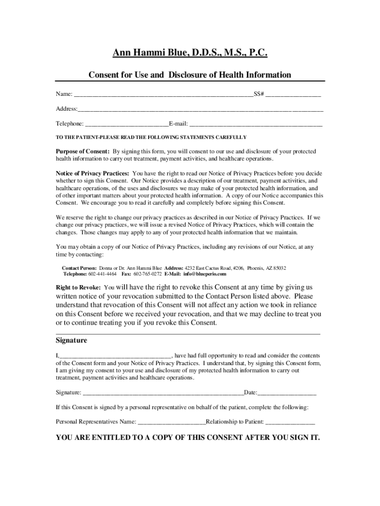 Ann Tammi Blue, D.D.S., M.S., P.C. Consent for Use and Disclosure of Health Information Name: SS# Address: Telephone: Email: TO THE PATIENTPLEASE READ THE FOLLOWING STATEMENTS CAREFULLYPurpose of