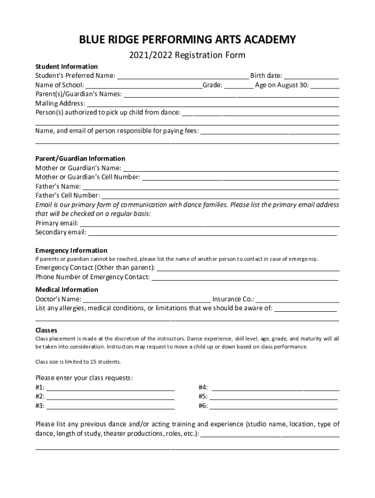 BLUE RIDGE PERFORMING ARTS ACADEMY 2021/2022 Registration Form Student Information Students Preferred Name: Birth date: Name of School: Grade: Age on August 30: Parent(s)/Guardians Names: Mailing