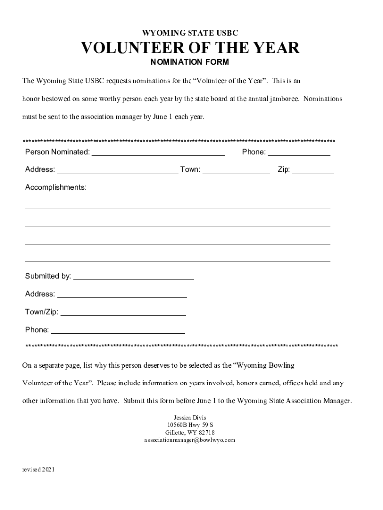 WYOMING STATE USBCVOLUNTEER OF THE YEAR NOMINATION Forth Wyoming State USB requests nominations for the Volunteer of the Year. This is an honor bestowed on some worthy person each year by the state