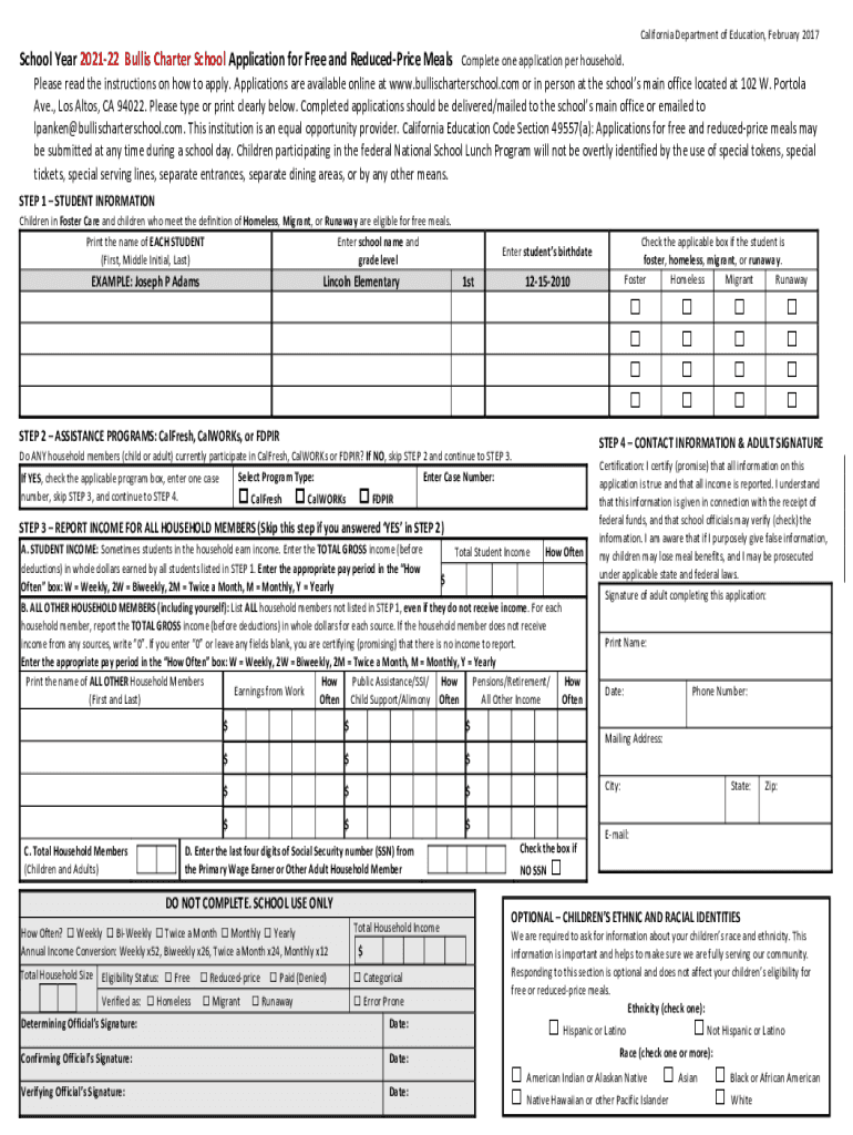 California Department of Education, February 2017School Year 202122 Bulls Charter School Application for Free and Reduced Price Meals Complete one application per household. Please read the instructions