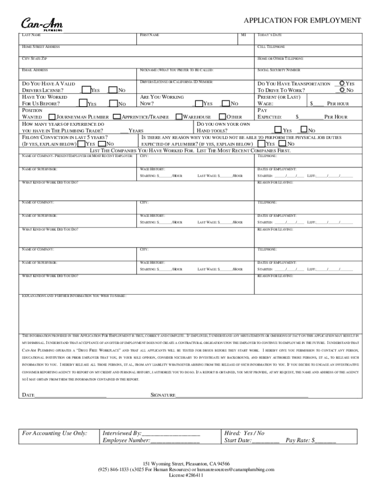 Get the free APPLICATION FOR EMPLOYMENT - canamplumbing.com