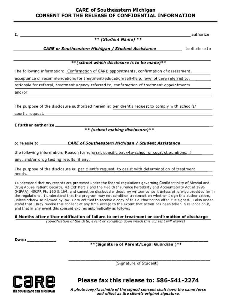 CARE of Southeastern Michigan Consents FOR THE RELEASE OF CONFIDENTIAL INFORMATION, authorize ** (Student Name) ** CARE or Southeastern Michigan / Student Assistance to disclose to**(school which