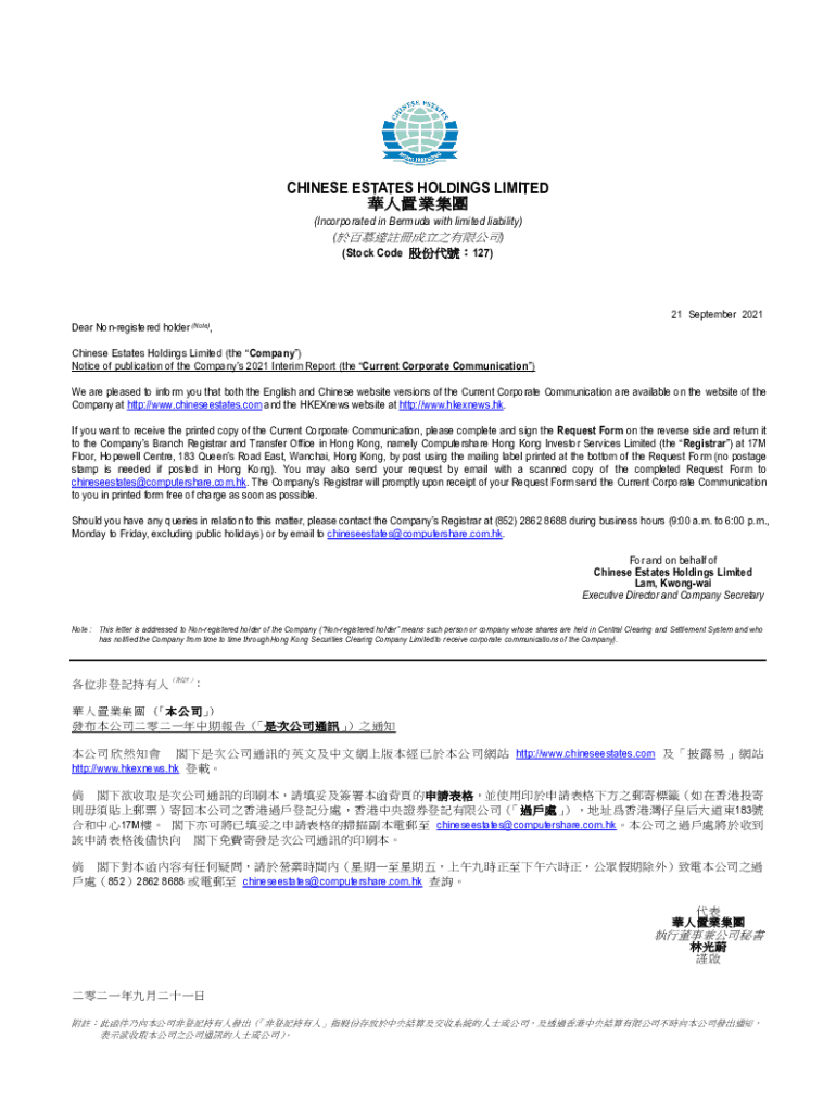 CHINESE ESTATES HOLDINGS LIMITED (Incorporated in Bermuda with limited liability) () (Stock Code 127)21 September 2021 Dear Nonregistered holder (Note), Chinese Estates Holdings Limited (the Company)