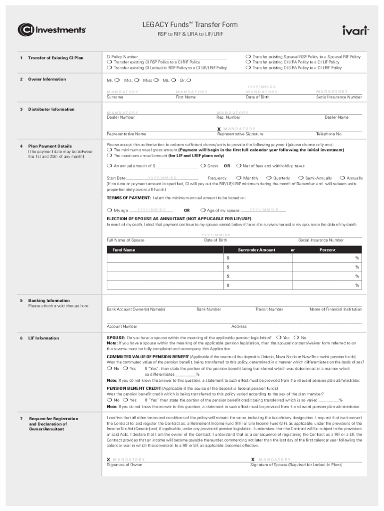LEGACY Funds Transfer Form RSP to RIF & LIRA to IF/LRIF1Transfer of Existing CI Planck Policy Number Transfer existing CI RSP Policy to a CI RIF Policy Transfer existing CI Locke din RSP Policy to