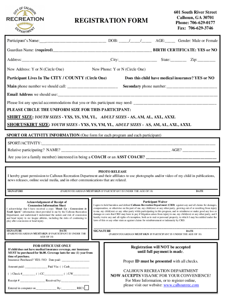 REGISTRATION FORM601 South River Street Calhoun, GA 30701 Phone: 7066290177 Fax: 7066293746Participants Name: DOB: / / AGE: Gender: Male or Female Guardian Name: (required) BIRTH CERTIFICATE: YES