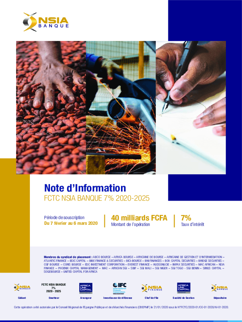 Note dInformationFCTC ASIA BANQUET 7% 20202025 Pride de subscription Du 7 frier Au 6 Mars 202040 milliards FCFA Montana de lopration7%Taux dintrtMembres Du syndicate DE placement : ABCs COURSE AFRICA
