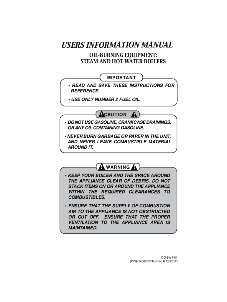 IMPORTANT READ AND SAVE THESE INSTRUCTIONS FOR REFERENCE. USE ONLY NUMBER 2 FUEL OIL.! CAUTION! DO NOT USE GASOLINE, CRANKCASE DRAINING, OR ANY OIL CONTAINING GASOLINE. NEVER BURN GARBAGE OR PAPER